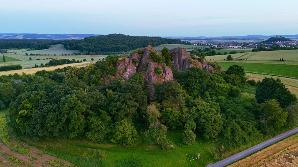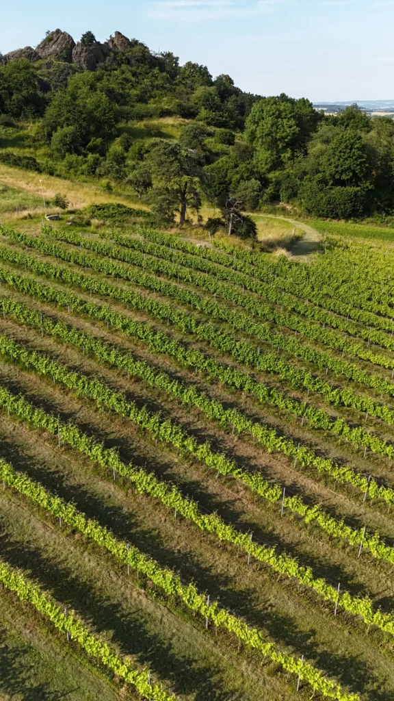 Der Weinberg am Scharfenstein liegt direkt neben dem namensgebenden Basaltkegel Scharfenstein, an dessen Fuß wir in 1996 die ersten Reben pflanzten. Über die Jahre lernten wir hier die Herausforderungen und Tücken des Weinbaus in Nordhessen kennen und kelterten die ersten Weine für den Eigenverbrauch.